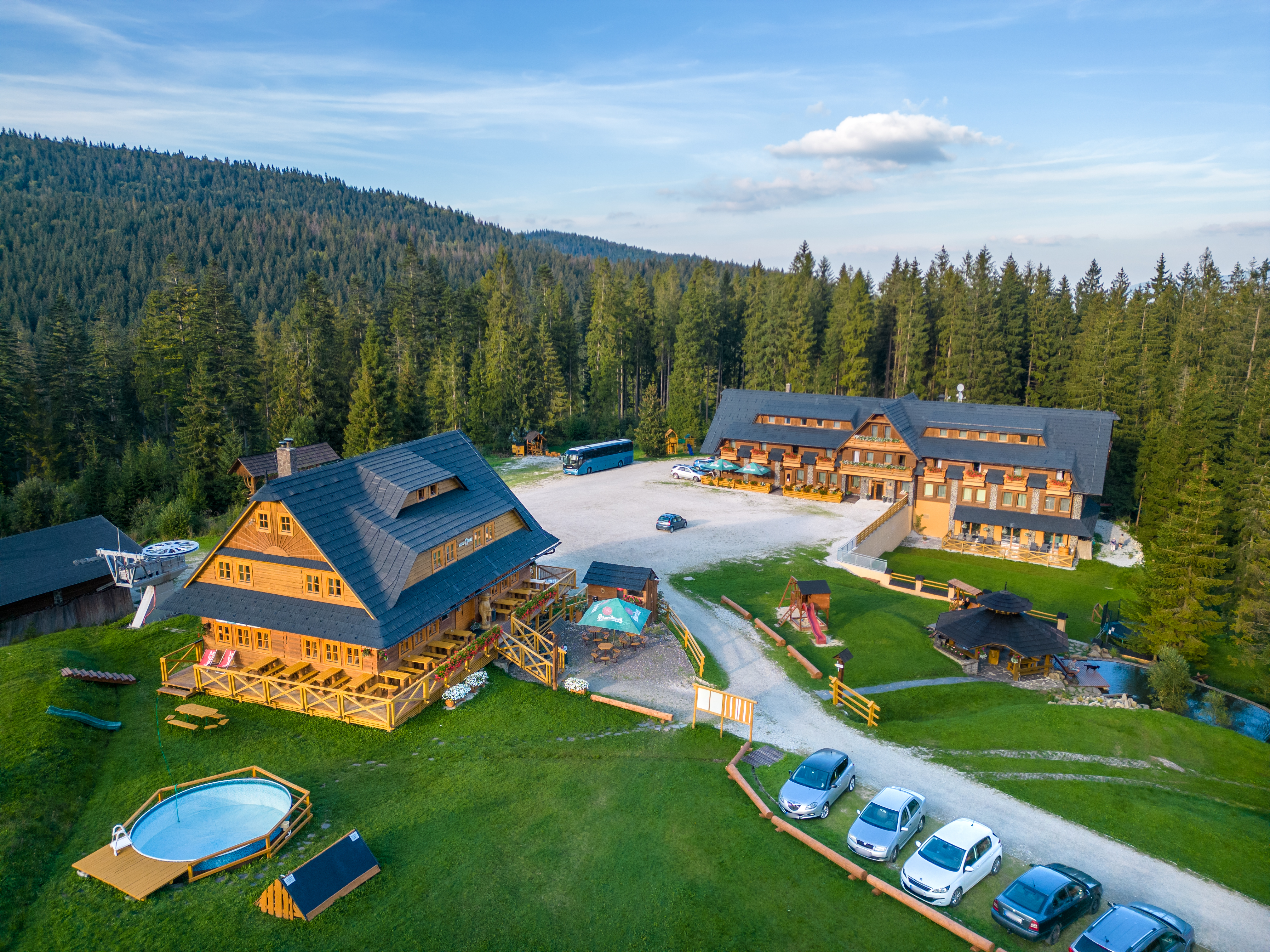 Enjoy your stay in the heart of nature, fall asleep by the sound of the forest and regenerate your body in an intact and picturesque countryside. Hotel Kristína is located on the north side of Oravská Magura in the middle of the fabulous and unspoilt nature and is part of the resort SKIZÁBAVA Hruštín. The hotel has a capacity of 39 beds. You can choose from the comfortably furnished double rooms and apartments with balcony and view over mountain or ski slope. There is also an optional accommodation for disabled persons, extra bed and baby bed. Each hotel room is equipped with helping baby stairs for your children. Of course there is WIFI connection. For long evenings, the hotel features a lounge with billiards, ping – pong tables, table football, darts and a wide range of board games. We also have children playground and mini corner for the youngest in the restaurant. Your pets are welcome in our place as well. If you are visiting in larger groups, you can enjoy the accommodation in our traditional “log cabin village” or at Koliba u Kuba.